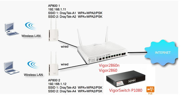 如果中間Switch例如VigorSwitch P1080或是VigorSwitch P2261(24Port可以接12Port) ps:實際使用請考慮Vigor2860所能承載的Client數 所以架構如附圖